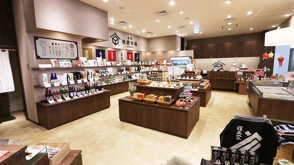 武蔵ケ辻交差点の角にある印象的な建物が「かなざわはこまち」。金沢のおもてなしがたくさんつまった商業施設で、その1階にある『花えにし/金沢地酒市場』は、金沢の和菓子や地酒とともに金沢カレーレトルトも揃っています。